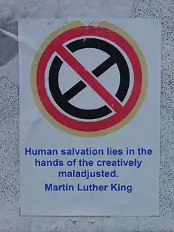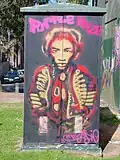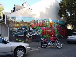 Since the 1980s, the area surrounding the Sydney inner west suburb of Newtown, Australia, including the suburbs of Newtown, Enmore, Erskineville, Camperdown, and St Peters, has been known for its wide range of prominent graffiti and street art on walls.[1] The public visual art in the Newtown area consists of a variety of styles and methods of execution, including large-scale painted murals, hand-painted (or sprayed) political slogans, hand-painted figurative designs, spray painted semi-abstract designs (including large-scale and elaborate semi-pictorial) "tags"), and other stylistic developments such as stencil art and street poster art (also known as "wheatpasting"), "Yarn bombing", and sculptural items cast from plaster and other materials.[2]
