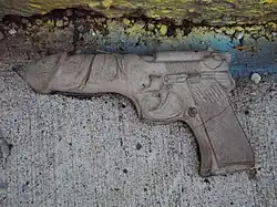 - The concrete graffiti style uses objects cast in concrete or a similar material, which are often glued into place on a footpath or against a wall. Around Newtown, many of these objects appear to have been created by the same artist, Will Coles, as a commentary on consumer culture. They have often been in the form of familiar items such as televisions and TV remote controls, and feature inscribed single-word slogans such as "fear" or "hate". These largest of these objects are the installations on King Street and on the corner of Gladstone Street, Enmore; both are full-scale replicas of a medium-size CRT television mounted on top of a replica VCR. The King Street object (now defaced by marker tags) is inscribed with the slogan "life is fleeting" and the Gladstone Street object with the word "obsolescence". Other concrete graffiti objects (such as those pictured above in May Street, St Peters) are partial representations of human-like faces, which appear to be based on medieval gargoyles.[16][17]
