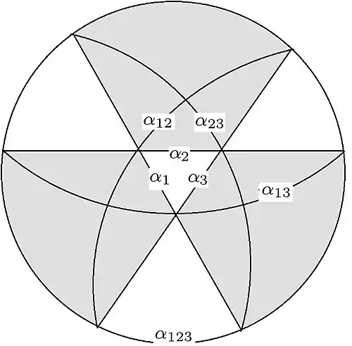 It has roots ( resp. hyperplanes, in the pictures bounding equilateral triangle resp. diagonals in squares, in the super Lie algebra odd resp. even roots). It visibly has different types of Weyl chambers (equilateral triangles resp. right triangles) with different Cartan matrices in which the roots in terms of simple roots are as follows: