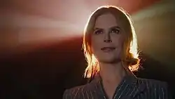 ![]() Kidman seated and lit from behind by colorful lights emanating from a movie projector. A raised platform was constructed inside the theater to achieve this effect. | |