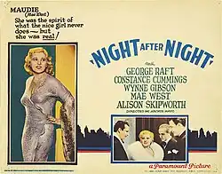 Night After Night is a 1932 American pre-Code drama film starring George Raft, Constance Cummings, and Mae West in her first movie role. Others in the cast include Wynne Gibson, Alison Skipworth, Roscoe Karns, Louis Calhern, and Bradley Page. Directed by Archie Mayo, it was adapted for the screen by Vincent Lawrence and Kathryn Scola, based on the Cosmopolitan magazine story Single Night by Louis Bromfield, with West allowed to contribute to her lines of dialogue.