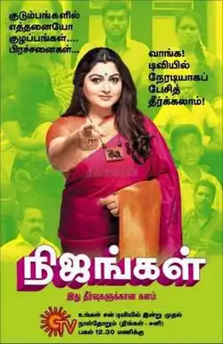 Nijangal (transl. Realities) is a 2016-2017 Tamil-language reality-justice show about real-life situations. It aired every Monday to Saturday at 12:30PM (IST) on Sun TV and was re-telecast Monday to Saturday at 10:00PM (IST) on Sun News replacing previous successful serial Ponnonjual from 24 October 2016 to 4 March 2017 for 218 episodes.[1] The Show host by Khushboo Sundar.[2][3][4][5] The show revolves around real life situations and they try to come up with a solution for the same on the channel. It was Produced by Vaidehi Ramamurthy and director by Mani Sridhar.
