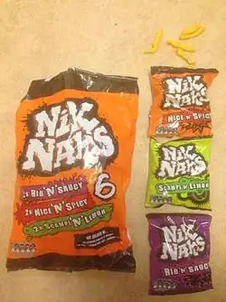 Nik Naks are a type of extruded corn snack previously manufactured by Sooner Snacks in Scunthorpe, England.[1] The snack was introduced in 1982.[2] The brand owner Sooner Snacks was purchased by Golden Wonder owner Dalgety plc in 1992[3][4] and then sold to United Biscuits in 2006. In December 2012, United Biscuits agreed to sell the KP Snacks brand, including Nik Naks, to the European Intersnack group.[5] As of 2021, Nik Naks are made in three flavours (all of the format "X 'n' Y") with different colour packaging for each.