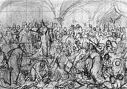 Nikita Pustosvyat. Debate about faith is a large-format painting by Russian artist Vasily Perov (1834-1882), created between 1880 and 1881. It belongs to the collection of the State Tretyakov Gallery (Inventory 407). The size of the painting is 336.5 × 512 cm.[1] The painting was not finished due to tuberculosis which caused death of the artist, who died of consumption in 1882. In the same year, the canvas was purchased from Perov's heirs by Pavel Tretyakov.[1]