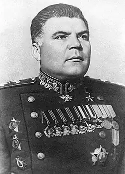 Meanwhile, General-leytenant Dmitry Lelyushenko's 3rd Guards, General-leytenant Vyacheslav Tsvetayev's 5th Shock, and General-leytenant Alexey Grechkin's 28th Armies of the 4th Ukrainian Front, supported by General-leytenant Timofey Khryukin's 8th Air Army, were to destroy the German troops in the Nikopol bridgehead – the IV and XXIX Army Corps of Group Schörner, commanded by General der Infanterie Friedrich Mieth and General der Panzertruppe Erich Brandenberger, respectively.[30] General-leytenant Karp Sviridov's 2nd Guards Mechanized Corps was to be inserted into the breakthrough in the 5th Shock Army's sector.[31]