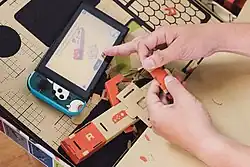Nintendo Labo is released as individual Labo Kits, each containing a set of pre-made cardboard cut-outs and other materials, used to make one or more "Toy-Con", and a Nintendo Switch game card, which contains interactive instructions on how to assemble the Toy-Con and software that the Toy-Con can interact with. Once each Toy-Con is constructed, players insert the main Nintendo Switch display and/or one or both of the Joy-Con controllers according to the instructions. Each Toy-Con functions differently in the ways it interacts with either the Joy-Con or the main display. For example, the piano Toy-Con's keystrokes are read by the Right Joy-Con controller's infrared sensor to identify notes being played, while robotic Toy-Con move using HD Rumble from the Joy-Con controllers, which are controlled via the touchscreen. Players may freely decorate the cardboard parts using coloring pens, tape, and other materials, while more experienced users can invent new ways to play with each Toy-Con.[1][2] The game software provides instructions on how the Toy-Con works with the Switch, such as describing the fundamentals of infrared sensing.[1][3]