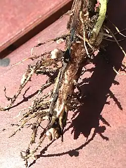 Plants that contribute to nitrogen fixation include those of the legume family—Fabaceae— with taxa such as kudzu, clover, soybean, alfalfa, lupin, peanut and rooibos.[39] They contain symbiotic rhizobia bacteria within nodules in their root systems, producing nitrogen compounds that help the plant to grow and compete with other plants.[58] When the plant dies, the fixed nitrogen is released, making it available to other plants; this helps to fertilize the soil.[16][59] The great majority of legumes have this association, but a few genera (e.g., Styphnolobium) do not. In many traditional farming practices, fields are rotated through various types of crops, which usually include one consisting mainly or entirely of clover.[60]