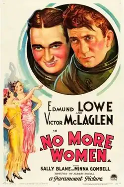 No More Women is a 1934 American pre-Code adventure film directed by Albert S. Rogell and starring Edmund Lowe, Victor McLaglen, Sally Blane and Minna Gombell. The film was released and distributed by Paramount Pictures.[1][2] It was part of a long-running series that paired Lowe and McLaglen as friendly rivals dating back to the 1926 silent film What Price Glory?