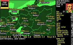 The player can make many choices during the campaign, such as, according to Evan Brooks of Computer Gaming World: "One may transfer soldiers between fiefs, go to war, increase taxes (which causes a decrease in peasant loyalty which may lead to rebellion), transfer rice or gold to another fief, raise the level of flood control (which decreases productivity), make a non-aggression pact or arrange a marriage, cultivate (which increases productivity, but decreases peasant loyalty), use a merchant (to buy/sell rice, borrow funds, or purchase weapons), recruit for the military (soldiers or ninja), train the army (which increases fighting efficiency), spy on a rival, expand a town (which increases taxes collected, but decreases peasant loyalty), give food/rice to peasants/soldiers (to raise morale), steal peasants from rival daimyos, allocate military strength, recuperate (even a daimyo can get sick), turn over a controlled fief to the computer for administration, or pass a turn (hint: when one has no idea of what to do, train the troops.)"[3]
