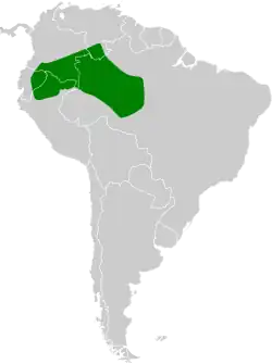 The nocturnal curassow is found in middle and upper Amazonia, from far southern Venezuela, southeastern Colombia, eastern Ecuador, and northeastern Peru into western and central Brazil. It inhabits terra firme forest and flooded forests (both permanent and seasonal). It favors low lying, gentle, terrain, often near blackwater rivers. It is typically found below 850 m (2,800 ft) but has been recorded as high as about 1,500 m (4,900 ft) in Ecuador.[5]