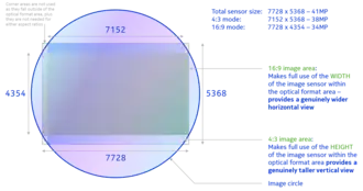 Depending on the aspect ratio chosen by the user, the sensor will use a maximum of either 7728×4354 pixels (33.6 MP; full sensor width) for 16:9 images, or 7152×5368 pixels (38.4 MP; full sensor height) for 4:3 images[14] when using the default camera software, although third-party apps exist that can capture the full resolution of the sensor. The output from the sensor is processed using the on-chip image processor, resulting in a lower-resolution final image with a default resolution of 5 MP through pixel binning (oversampling) from the full 34/38 MP image. The image processor highly reduces external processing needs and data rates as well as image noise (see noise shaping). The pixel binning was non-destructive, meaning the user could reframe the image or zoom in after the shot was taken.[14]