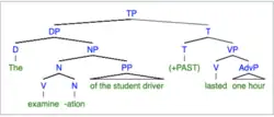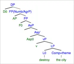 Alexiadou (2001) adopts a structural approach to accounting for eventative versus non-eventative interpretations of deverbal nominalization.[20] Her analysis posits that both interpretations (process nouns and result nouns) are associated with a distinct syntactic structure.[21] Alexiadou (2001) proposes that the functional structure of process nominals is much like that of verbs by including verb-like projections such as Aspect Phrase (AspP) and a light Voice Phrase (vP), but result nominals differ from verbs and have no Aspect Phrase or light Voice Phrase included in its functional structure therefore resembling the structure of an underived noun.[21]