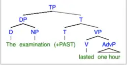 The second instance of examination has a simple event interpretation because while it is a derived nominal, according to Grimshaw, it does not "inherit" the verbal argument structure, and only the lexical/semantic content is projected.[20] The suffix, -ation, is attached to a verb, "examine." The interpretation of the sentence "The examination lasted one hour" is "The exam took one hour."