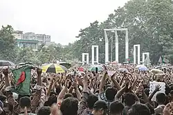 The non-cooperation movement,[a] also known as the one-point movement,[b] was a pro-democratic disinvestment movement and a mass uprising against the Awami League-led government of Bangladesh, initiated within the framework of 2024 Bangladesh quota reform movement. The sole demand of this movement was the resignation of Prime Minister Sheikh Hasina and her cabinet.[19][20] It was the final stage of the wider movement known as the July Revolution. Although the movement was initially limited to the goal of reforming quotas in government jobs, it snowballed into a mass anti-government uprising after the mass killings against civilians. The movement was also fueled by ongoing socio-economic and political issues, including the government's mismanagement of the national economy, rampant corruption by government officials, human rights violations, allegations of undermining the country's sovereignty by Sheikh Hasina, and increasing authoritarianism and democratic backsliding.[21][22][23]