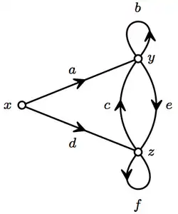 In this way, the subsets of built of from finitely many of these three operations can be identified with the semiring of regular expressions. Similarly, finite graphs whose edges are weighted by subsets of can be identified with finite automata, though generally that theory starts with singleton sets as in the figure.
