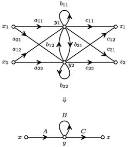 This system could be modeled as scalar signal-flow graph with multiple inputs and outputs. But, the variables naturally fall into layers, which can be collected into vectors x=(x1,x2)t y=(y1,y2)t and z=(z1,z2)t. This results in much simpler matrix signal-flow graph as shown in the figure at the top of the article.