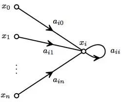 with aij elements in a ring or semiring R. The free variable x0 corresponds to a source vertex v0, thus having no defining equation. Each equation corresponds to a fragment of a directed graph G=(V,E) as show in the figure.