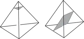 A normal surface intersects a tetrahedron in (possibly many) triangles (see above left) and quadrilaterals (see above right)