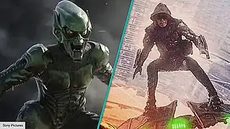 In No Way Home, the character obtains upgrades to his costume which make him more closely resemble his comic book counterpart.[13] The Goblin first appears wearing his 2002 costume before the mask is destroyed by Osborn. The upgraded costume is depicted with a purple undersuit beneath the green armor with the Goblin wearing goggles and incorporating the retractable blades from his glider into his left gauntlet. Screen Rant's Dan Zinski described the suit as tattered and noted the goal of the MCU's costume designs is "to find some middle ground" between the comic book version and the "more realistic".[36]