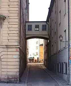 Norra Bankogränd (Swedish: "Northern Bank Alley") is an alley in Gamla stan, the old town of Stockholm, Sweden. Connecting Skeppsbron to Österlånggatan and Järntorget, it forms a parallel street to Tullgränd and Södra Bankogränd.
