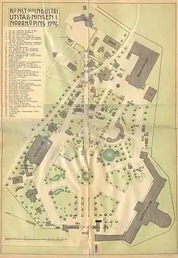 At the initiative of the local industrial association Norrköpings Fabriksförening och Handtverksförening it was decided an art and industrial exhibition should be held in Norrköping between June 1 – September 15, 1906.[1] The exhibition was opened by the Crown Prince Gustaf and was mostly held at the area south of the Sylten neighbourhood. The architect Carl Bergsten designed the exhibition's two main buildings the Industrihallen (industrial hall) that was 7,500 m2 (81,000 sq ft) with places for 630 exhibitors, and the Konsthallen (art exhibition hall). He also designed the Jaktpaviljongen (hunting pavilion). Werner Northun designed the Maskinhallen (engines hall) at a total of 3,600 m2 (39,000 sq ft), as well as the main restaurant seating 400 people and the Thaliatemplet theatre (500 folding chairs).