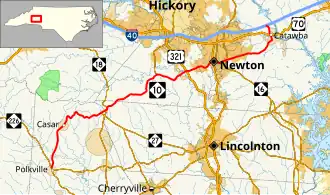 NC 10 winds its way through Propst Crossroads and Blackburn, and then crosses under US 321. It continues through Startown, entering Newton from the east and crossing US 321 Business. The road becomes C Street, takes a sharp curve and passes through downtown Newton as D Street. On the east side of Newton, NC 10 curves left then heads off east, crossing NC 16. At Catawba, the road makes a sharp left north. Once it crosses US 70, NC 10 reaches its eastern terminus at Interstate 40 (exit 138) in Catawba County, just southwest of Statesville.