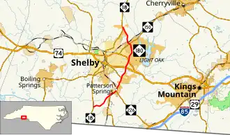 North Carolina Highway 180 (NC 180) is a primary state highway in the U.S. state of North Carolina. The highway serves as a bypass east of Shelby, serving as an alternate through route of NC 18.