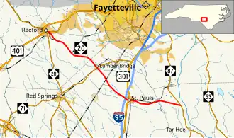 The highway then interchanges I-95 and then intersects US 301 as it passes through St. Pauls as Broad Street. The route then enters Bladen County and reaches its eastern terminus at NC 87 north of Tar Heel.[3]