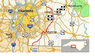 North Carolina Highway 200 (NC 200) is a primary state highway in the U.S. state of North Carolina. The highway runs north–south from the South Carolina state line near the community of JAARS, to US 601 near Concord.