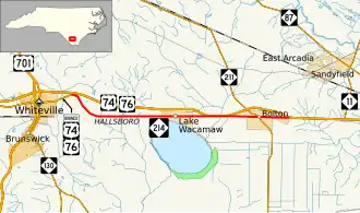 NC 214 begins at an intersection with Business U.S. Routes US 74 Business and US 76 Business about 1+1⁄2 miles (2.4 km) east of Whiteville. The intersection is located just south of exit 244 on US 74/US 76. The two-lane road heads southeast then due east through a rural area until reaching the communities of Hallsboro and Artesia. NC 214 heads north of Lake Waccamaw. Though the road never strays more than 1 mile (1.6 km) from the US 74/US 76 freeway throughout its entire length, the freeway dips south to cross the Friar Swamp/Green Swamp immediately adjacent to the lanes of NC 214. After heading through the town of Bolton where it intersects NC 211, the road briefly widens from a two-lane road to a four-lane divided highway but soon ends at an intersection with US 74/US 76 1 mile (1.6 km) east of the town.[1]