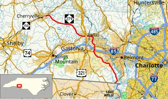 North Carolina Highway 277 (NC 277) was established in 1931 as a new primary routing; it connected U.S. Route 74 (US 74)/NC 20, in Gastonia to NC 150 in Cherryville. In 1936, its southern terminus was truncated at NC 275 in Dallas. In 1938, its western terminus was moved through downtown Cherryville to NC 274; it is unknown when it was overlapped with NC 274 to end at Church and Mountain streets. Between 1954 and 1957, the alignment along the route was straightened, creating several small loop roads along the route, several of which say "Old NC 277". In 1979, NC 277 was renumbered to NC 279, to accommodate for Interstate 277.[2]