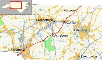 North Carolina Highway 49 (NC 49) is a 177.8-mile (286.1 km) primary state highway in the U.S. state of North Carolina. It traverses much of the Piedmont region, connecting the cities of Charlotte, Asheboro, and Burlington.