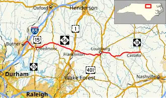 NC 56 is a predominantly two-lane rural highway connecting the three Counties of Granville, Franklin and Nash. Acting as a spur route, it begins at the intersection of Central Avenue/C Street, in Butner, and goes northeast to connect with I-85 (exit 191). Going southeasterly, it enters Creedmoor and has two brief concurrencies with US 15 and NC 50. Going in an easterly direction, it crosses NC 96, in Wilton, halfway before reaching Franklinton, where it connects with both US 1 and US 1A. Continuing east for 8.5 miles (13.7 km), it reaches Louisburg, where it has another short concurrency with US 401 and NC 39 along Bickett Boulevard. At the intersection of East Nash Street, NC 56 begin its concurrency with NC 581 to Mapleville. Continuing east for another 9.3 miles (15.0 km), it reaches its eastern terminus at NC 58, just over the Franklin/Nash County line and north of Castalia.[1]
