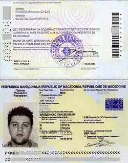 After the Prespa Agreement ending the naming dispute with Greece come into effect in February 2019, passports were stamped with the country's new name as an interim measure before new passports were issued. "This passport is property of the Republic of North Macedonia" appears on the trilingual stamp in English, French, and Macedonian.[2] The authorities began issuing the passports with the new country name starting from 1 July 2021[3] (postponed from September 2020). Old name passports remained valid until 12 February 2024.[4][5]