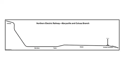 The Northern Electric Railway—Marysville and Colusa Branch was an interurban branch railroad in California, which ran from a junction with the Northern Electric Railway mainline (later the Chico Branch) near Yuba City (Colusa Junction) then west for 22.39 miles (36.03 km) to Colusa. The company was incorporated on June 6, 1910. Construction of the branch commenced in December 1911 and was completed on June 13, 1913.[1] The Northern Electric Railway—Marysville and Colusa Branch operated under lease to the Northern Electric Railway.[2]