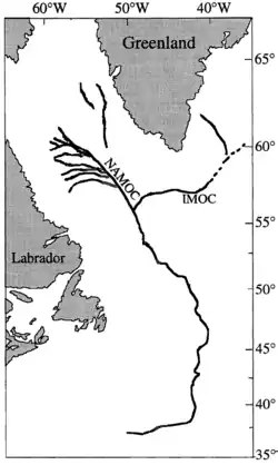 The Northwest Atlantic Mid-Ocean Channel (NAMOC) is the main body of a turbidity current system of channels and canyons running on the sea bottom from the Hudson Strait, through the Labrador Sea, and ending at the Sohm Abyssal Plain in the Atlantic Ocean. Contrary to most other such systems which fan away from the main channel, numerous tributaries run into the NAMOC and end there. The density of those tributaries is the highest near the Labrador Peninsula, but the longest tributary, called Imarssuak Mid-Ocean Channel (IMOC), originates in the Atlantic Ocean.
