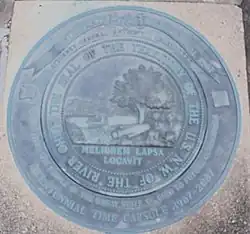 Seal of the Northwest Territory over a time capsule outside the Campus Martius Museum. The Latin phrase, "He has planted one better than the one fallen," signifies the replacement of wilderness by civilization.[39]