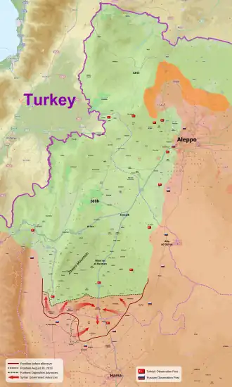 ![]() Situation in northwestern Syria as of 31 August 2019. Locations of Turkish and Russian outposts are pictured. Syrian Army control Syrian Opposition control Syrian Army & SDF control | |||||||||