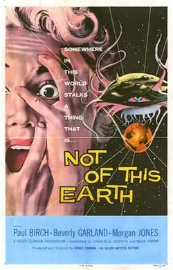 Not of This Earth is an independently made 1957 American black-and-white science fiction film produced and directed by Roger Corman (for his Los Altos Productions), that stars Paul Birch, Beverly Garland, Morgan Jones, William Roerick, and Anna Lee Carroll. The film was written by Charles B. Griffith and Mark Hanna and was distributed by Allied Artists Pictures Corporation as a double feature with Attack of the Crab Monsters.[3] Its theatrical release had a running time of 67 minutes, that was expanded to 70 minutes in 1962 for TV syndication.