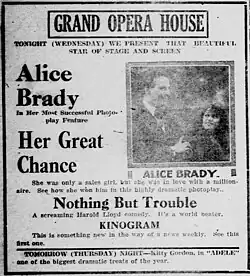 ![]() Advertisement of the movie shown with the main attraction Her Great Chance | |
