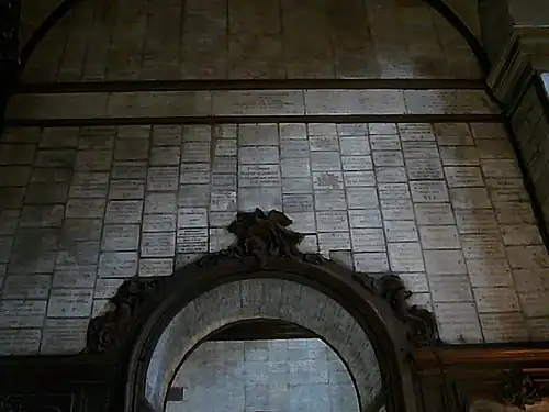 The Notre-Dame-des-Victoires (French pronunciation: [nɔtʁə dam de viktwaʁ]) is a minor basilica located on rue Notre-Dame-des-Victoires in the 2nd arrondissement of Paris. It was begun as an Abbey church, and constructed between 1629 and 1740 in the French classical style. Its name was given by King Louis XIII, who dedicated it to his victory over the Protestants at La Rochelle in 1628 during the French Wars of Religion.[1] Notre-Dame-des-Victoires is famous for the ex voto offerings left there by the faithful.[2] Over 37,000 devotional plaques, silver and gold hearts, as well as military decorations, have been left at the basilica. The closest Métro station is 'Bourse'.