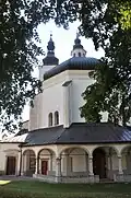 Nova Štifta is best known for its pilgrimage church dedicated to the Assumption of Mary. It is a Baroque church with an exterior arcade. It was built between 1641 and 1671[4] and was commissioned by the Jurij Khisl, lord of the castle in Ribnica, after a mysterious light appeared at Juniper Hill (Brinov vrh, 622 meters or 2,041 feet), as the site is known. The church has an octagonal nave and a smaller square chancel with beveled corners. The cupola rises 27 meters (89 ft) and is topped by a belfry with a Baroque roof. The church is probably based on the Renaissance Coronation of the Virgin Church in Lodi, Italy, which was a model for many later churches in Slovenia.[5]