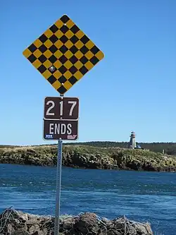 The western terminus is a look-off in Westport beside the Joshua Slocum monument with a view of Grand Passage and the Peter Island Lighthouse.