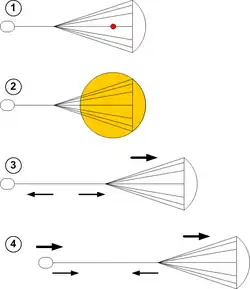 A Medusa spacecraft would deploy a large sail ahead of it, attached by independent cables, and then launch nuclear explosives forward to detonate between itself and its sail. The sail would be accelerated by the plasma and photonic impulse, running out the tethers as when a fish flees a fisher, generating electricity at the "reel". The spacecraft would use some of the generated electricity to reel itself up toward the sail, constantly smoothly accelerating as it goes.[11]