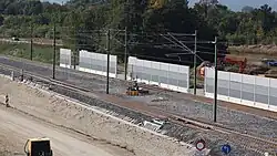 In June 2013, the Dörfles-Esbach connecting curve was connected to the existing network, in order to be able to carry the rails for the construction of the line, among other things.[97] The rails of the new line came from several large German track manufacturers and some were carried by goods trains on the lines from Coburg[98] and Erfurt.[99] At the end of November 2014 Deutsche Bahn announced that all 29 bridges on the new line had been completed.[100]