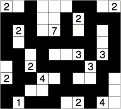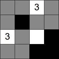 - Each numbered cell belongs to a white area, the number indicates how many cells belong to the white area. Some white areas may not include a numbered cell.