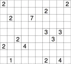 The puzzle is played on a typically rectangular grid of cells, some of which contain numbers. Cells are initially of unknown color, but can only be black or white. Two same-color cells are considered "connected" if they are adjacent vertically or horizontally (touching diagonally doesn't count). Connected white cells form "islands", while connected black cells form the "sea".