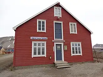 The museum is housed in a building constructed in 1917, originally for storage. It was eventually converted into the town store in 1920. The museum was created long afterwards, in 1988, and the building has remained in use as such since. The exterior of the wooden structure has been largely preserved, due to its cultural heritage values.[3] The interior has gone through several redevelopments and improvements. In 2009 a new information centre was opened in the building alongside the museum, providing an introduction to the environmental research going on in the area.[4] In 2011 Kings Bay received significant funds from the Svalbard Environmental Protection Fund for a project to modernize the museum and its exhibitions, scheduled for completion in the Summer of 2014.[5] Things featured in the remodelled museum, which is unstaffed for the most part, include exhibits on the history of Ny-Ålesund since the site was first visited in the 1600s, the coal mining industry, the 1962 accident, early aviation on Svalbard, the scientific research carried out in Ny-Ålesund, and the settlement's society and culture.[6]