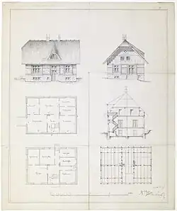 The building is one of Bindesbøll's six so-called "cottages". It is a rectangular, single-storey building constructed on a foundation of boulders, with a broad lower band of red brick and yellow brick on the upper part of the ground floor. The garden side features an avant-corps with a gabled dormer window. The south gable of the building features a veranda and a balcony. The quarter-hipped roof with ornamental Bargeboars was originally thatched. It was later replaced with wooden shingles and now with roofing felt.[4]