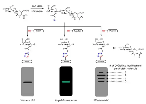 Chemoenzymatic labeling provides an alternative strategy to incorporate handles for click chemistry. The Click-IT O-GlcNAc Enzymatic Labeling System, developed by the Hsieh-Wilson group and subsequently commercialized by Invitrogen, utilizes a mutant GalT Y289L enzyme that is able to transfer azidogalactose (GalNAz) onto O-GlcNAc.[30][46] The presence of GalNAz (and therefore also O-GlcNAc) can be detected with various alkyne-containing probes with identifiable tags such as biotin,[46] dye molecules,[30] and PEG.[31]